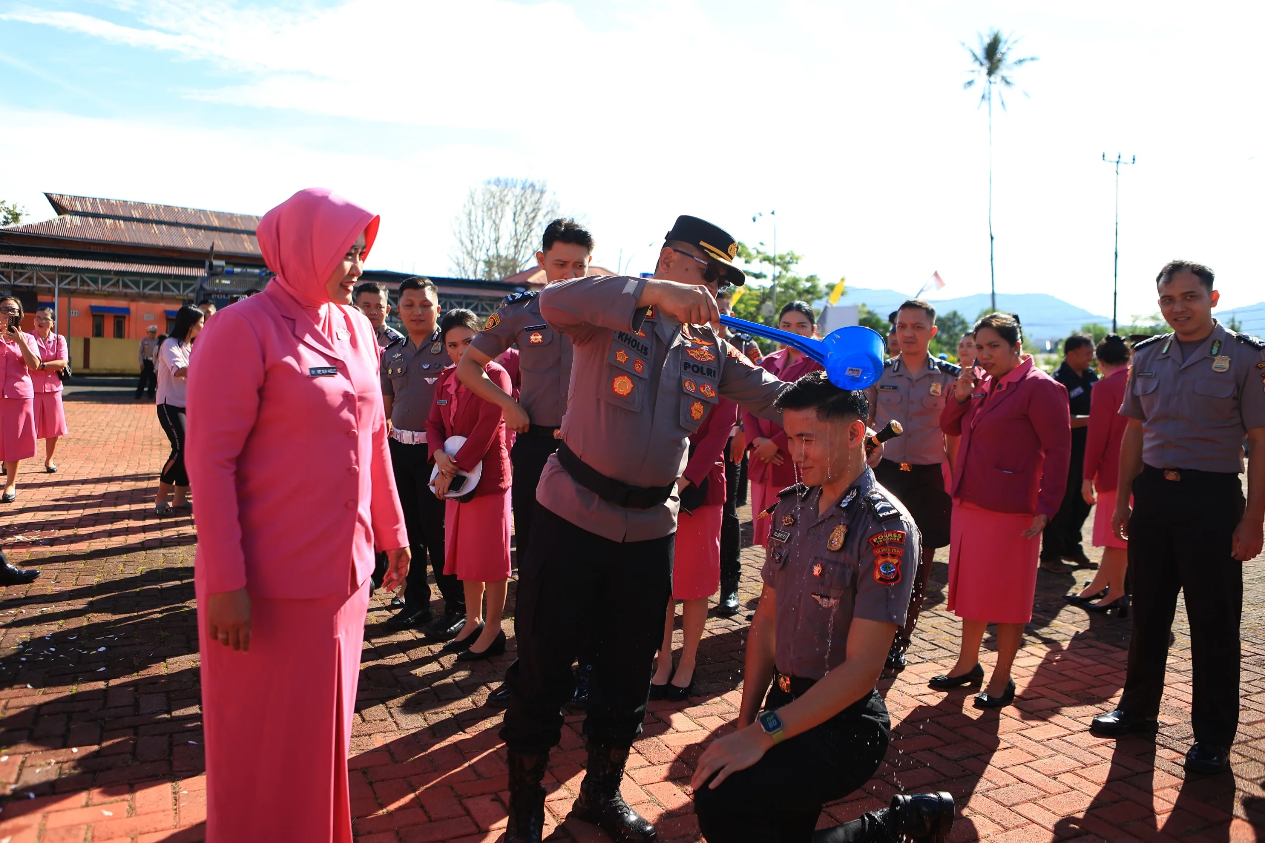 Setelah upacara, kegiatan dilanjutkan dengan tradisi penyiraman air kembang kepada para personil yang naik pangkat. Tradisi ini sebagai simbol rasa syukur dan penyemangat untuk terus berkarya dan bertugas sebagai pelindung, pengayom, dan pelayan masyarakat.