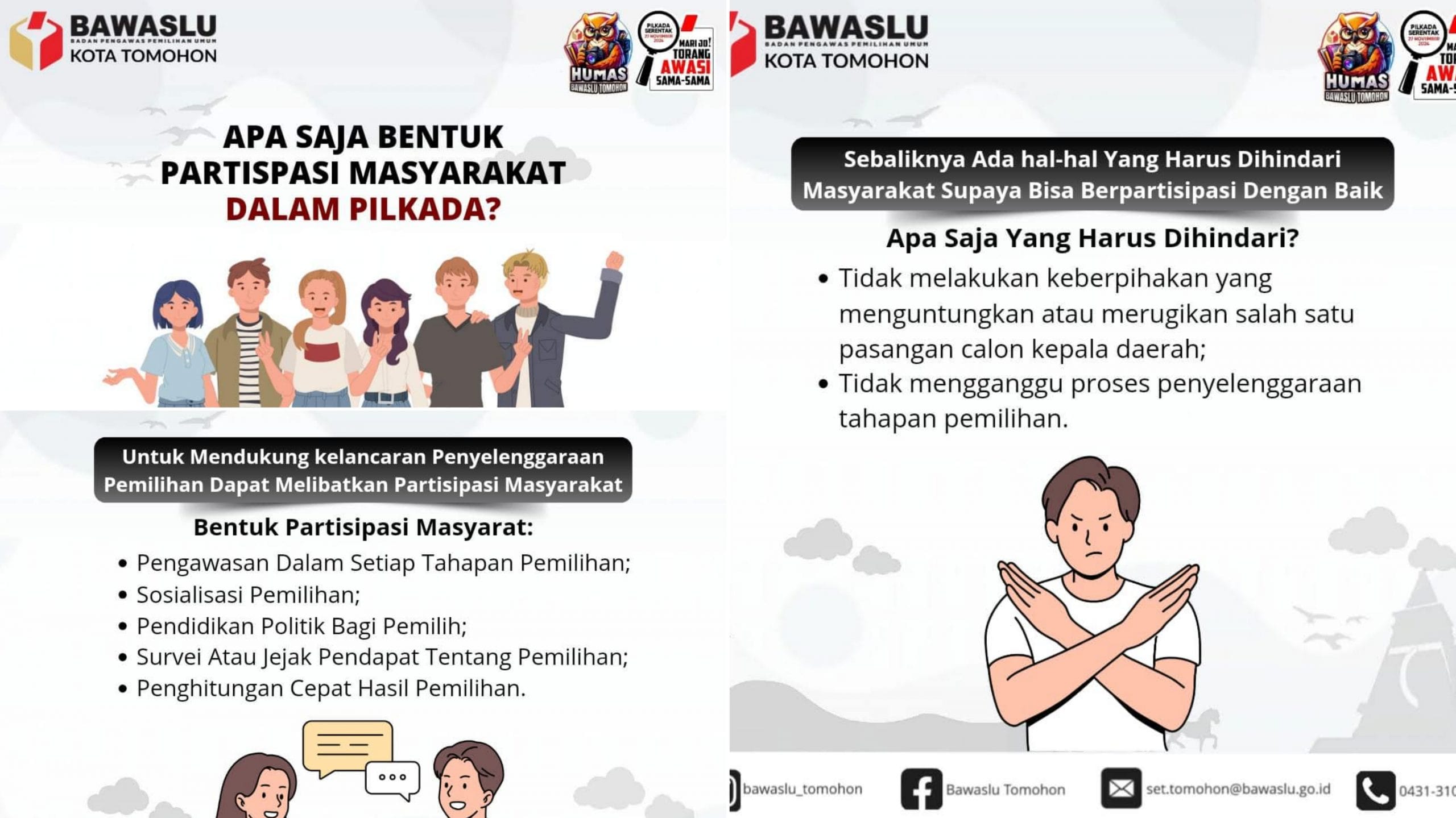 NusantaraInfo.net|| Badan Pengawas Pemilihan Umum (Bawaslu) Kota Tomohon mengimbau masyarakat untuk aktif berpartisipasi dalam penyelenggaraan pemilihan kepala daerah. Partisipasi masyarakat dinilai penting untuk mendukung kelancaran dan transparansi proses demokrasi. Rabu (25/09).