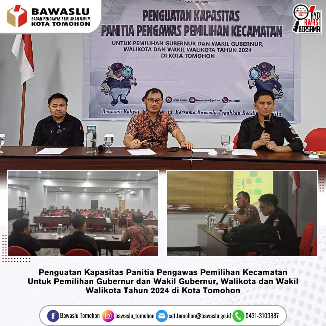 NusantaraInfo.net|| Bawaslu Kota Tomohon menggelar kegiatan Penguatan Kapasitas Panitia Pengawas Pemilihan Kecamatan dalam rangka menyambut Pemilihan Gubernur dan Wakil Gubernur, serta Walikota dan Wakil Walikota Tahun 2024 di Kota Tomohon. Kegiatan ini berlangsung pada Sabtu (01/06) dan dihadiri oleh berbagai pihak terkait.