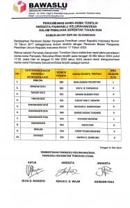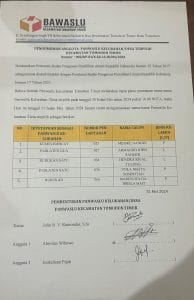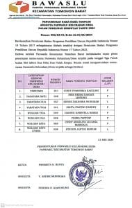 NusantaraInfo.net|| Badan Pengawas Pemilihan Umum (Bawaslu) Kota Tomohon telah resmi mengumumkan nama-nama anggota Panitia Pengawas Kelurahan/Desa (PKD) terpilih untuk Pemilihan Serentak 2024. Pengumuman ini didasarkan pada Peraturan Bawaslu RI nomor 19 Tahun 2017 yang telah diubah terakhir dengan Peraturan Bawaslu RI nomor 17 Tahun 2023.
