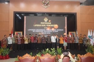 Anggota VI BPK RI Dr. Pius Lustrilanang, S.I.P., M.Si., CSFA., CFrA. dan Gubernur Sulawesi Utara Olly Dondokambey, S.E. dalam sambutannya bersama-sama mengucapkan selamat kepada seluruh Kabupaten/Kota di Sulawesi Utara yang semuanya mendapatkan opini Wajar Tanpa Pengecualian (WTP)