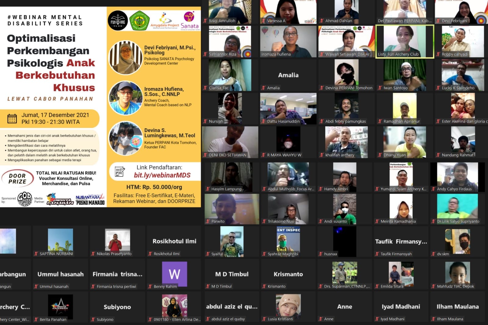 Tomohon, nusantarainfo.net – Dalam rangka bulan Disabilitas, Fun Archery Club (FAC) mengadakan webinar Mental Health Disability Series “Optimalisasi Perkembangan Psikologis Anak Berkebutuhan Khusus Lewat Cabor Panahan”. Dengan narasumber psikolog yang berkompeten dan berpengalaman serta pelatih panahan yang sudah tersertifikasi, dan dengan dukungan dari PERPANI Kota Tomohon, FAC sukses menjalankan webinar dengan antusiasme peserta yang berasal dari berbagai daerah di Indonesia, termasuk para orangtua, pelatih, guru, dan anggota klub panahan lainya.