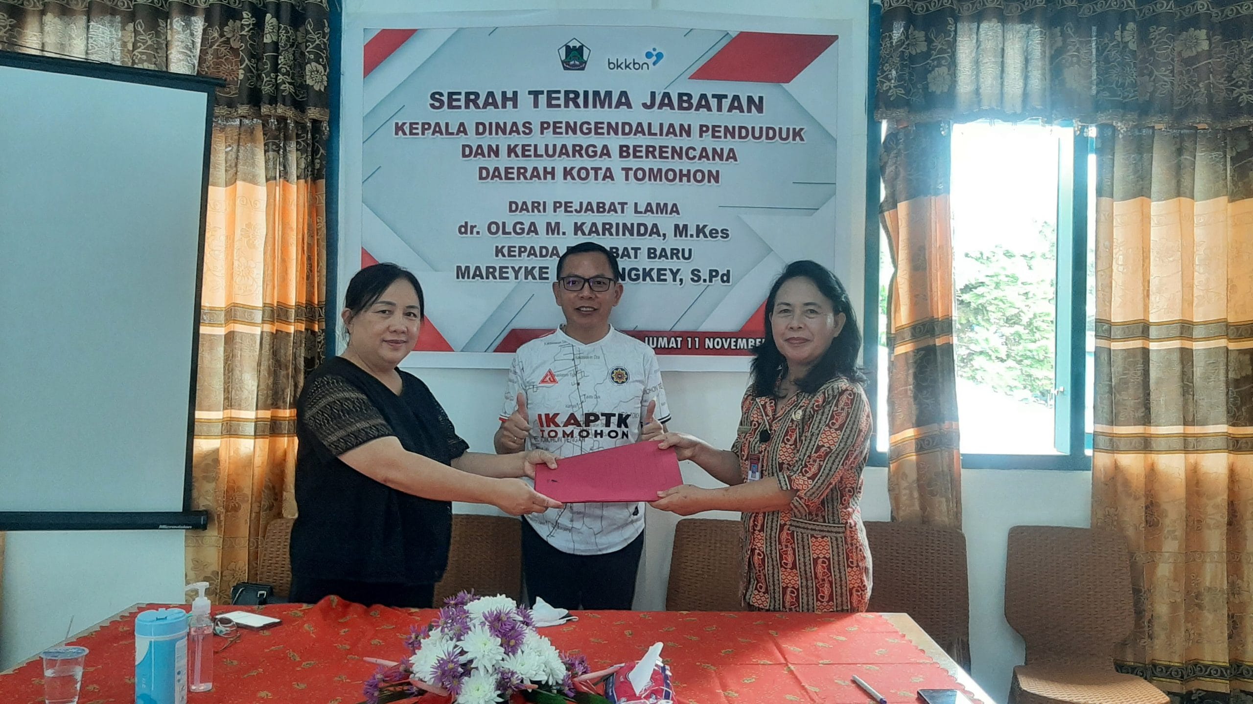 NusantaraInfo.net|| Pemkot Tomohon melaksanakan Serah Terima Jabatan Kepala Dinas Pengendalian Penduduk dan Keluarga Berencana (PPKB) dari dr Olga Karinda kepada Mareyke Manengkey. Jumat (11/11), di Aula Kantor Dinas PPKB. Disaksikan Asisten Pemerintahan dan Kesejahteraan Rakyat (Kesra) Sektretaris Daerah Kota Tomohon ODS Mandagi, mewakili pimpinan tertinggi yakni Wali Kota dan Wakil Wali Kota Tomohon Caroll-Wenny