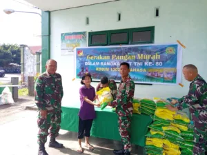 Tomohon, nusantarainfo.net – Dalam rangka memperingati Hari Ulang Tahun (HUT) ke-80 Tentara Nasional Indonesia, Koramil 1302-06/Tomohon menggelar Gerakan Pangan Murah yang berlangsung di wilayah Kecamatan Tomohon Tengah, Kamis (9/10/2025).