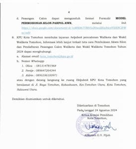 NusantaraInfo.net|| Komisi Pemilihan Umum (KPU) Kota Tomohon merilis pengumuman tentang Pendaftaran Pasangan Calon Walikota dan Wakil Walikota Kota Tomohon Tahun 2024, dengan nomor 429/PL.02.2-PU/7173/2/2024.