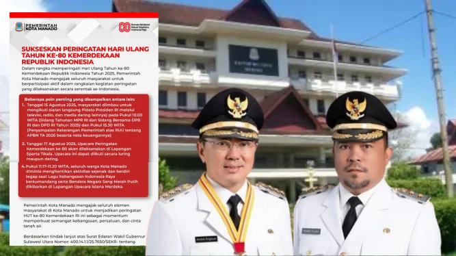 Manado, nusantarainfo.net- Menyambut peringatan Hari Ulang Tahun (HUT) ke-80 Kemerdekaan Republik Indonesia, Pemerintah Kota Manado mengajak seluruh masyarakat untuk berpartisipasi aktif dalam rangkaian kegiatan yang akan digelar serentak di seluruh Indonesia. Seruan ini disampaikan sebagai tindak lanjut atas Surat Edaran Wakil Gubernur Sulawesi Utara Nomor 400.14.1.1/25.7650/SEKR yang merujuk pada surat dari Menteri Sekretaris Negara Republik Indonesia.