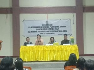 Sekretariat DPRD menyelenggarakan Sosialisasi Program Pembentukan Peraturan Daerah Kota Tomohon Tahun 2024 di Kelurahan Paslaten 1, Jumat 8 Desember 2023, menghadirkan narasumber yakni anggota DPRD Ibu Siane J. Samatara, S.E dan Bapak Rolando Ngeget, SH., Mh.