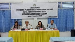 Sekretariat DPRD menyelenggarakan Kegiatan Sosialisasi Program Pembentukan Peraturan Daerah Kota Tomohon Tahun 2024 di Kecamatan Tomohon Timur. Jumat, 8 Desember 2023, menghadirkan narasumber yakni anggota DPRD Kota Tomohon Ibu Cherly Mantiri, SH dan Kabag Hukum Setda Kota Tomohon Berny Mambu, SH.,MH.