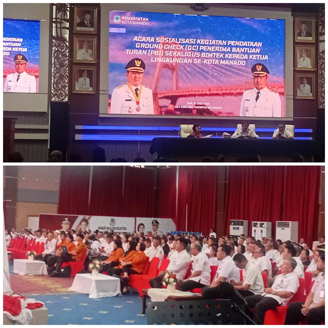 Manado, nusantarainfo.net || Walikota Manado Andrei Angouw menegaskan pentingnya akurasi dan pembaruan data warga dalam pelaksanaan Sosialisasi Kegiatan Pendataan Ground Check (GC) Penerimaan Bantuan Iuran (PBI) yang dirangkaikan dengan bimbingan teknis (Bimtek) bagi Ketua Lingkungan se-Kota Manado, Rabu (4/3/2026).