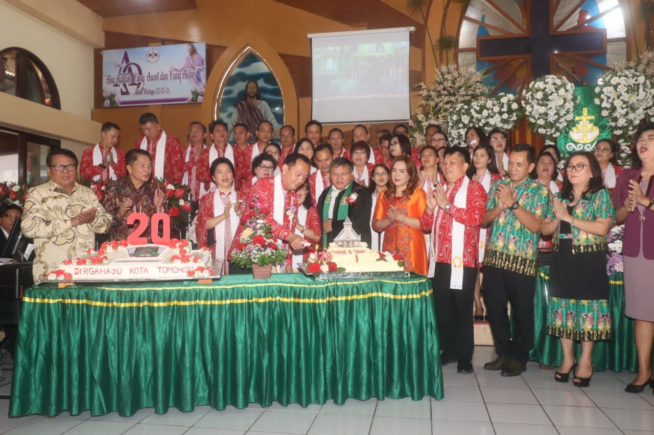NusantaraInfo.net||Wali Kota Tomohon Caroll Joram Azarias Senduk, S.H. bersama Ketua TP-PKK Kota Tomohon Ibu drg. Jeand’arc Senduk-Karundeng menghadiri Ibadah Syukur Hari Ulang Tahun Ke- 178 Jemaat GMIM Kakaskasen Pniel dan dirangkaikan dengan Penutupan Kegiatan Hari Jadi ke-20 Kota Tomohon. Minggu (29/01/2023). Ibadah Syukur ini dipimpin oleh Khadim Ketua Badan Pekerja Majelis Sinode GMIM Pdt. Dr. Hein Arina