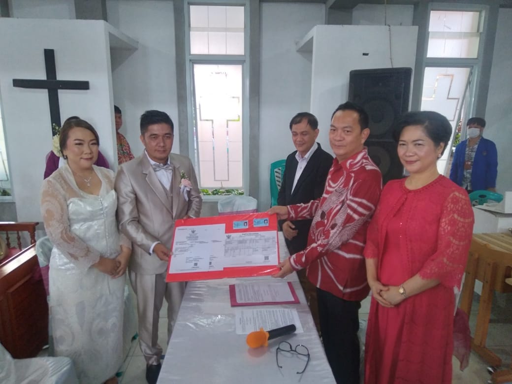 NusantaraInfo.net|| Wali Kota Tomohon Pnt Caroll J A Senduk SH, catat pernikahan dari Jan Leonard Kaeng dengan Jeane Mantiri, dlaksanakan di gedung gereja GMIM “Nazaret” Matani Wilayah Tomohon Satu, Kamis (23/2/2023).Khadim dalam ibadah, Pdt Ouckvy Oley Wenas STh, selaku Ketua BPMJ “Nazaret” Matani.