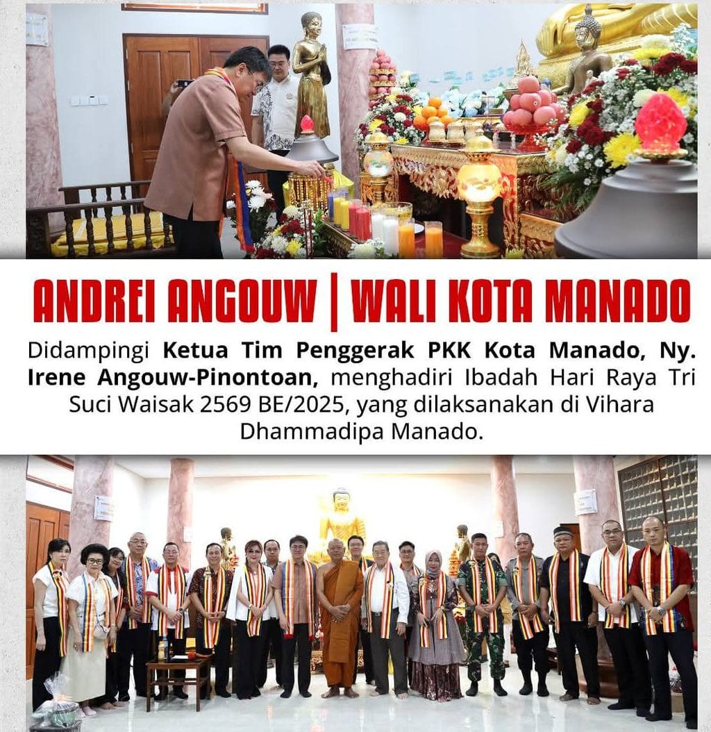 Manado, nusantarainfo.net – Wali Kota Manado, Bpk. Andrei Angouw, bersama Ketua Tim Penggerak PKK Kota Manado, Ny. Irene Angouw-Pinontoan, Senin (12/05/2025) menghadiri Ibadah Hari Raya Tri Suci Waisak 2569 BE/2025 yang berlangsung khidmat di Vihara Dhammadipa Manado.
