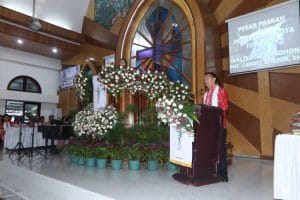 “Oleh karena itu, sebagai orang yang percaya kepada Yesus Kristus yang adalah juruselamat umat manusia, hendaknya kita imani bersama bahwa dengan peristiwa kebangkitan Kristus ada jaminan pasti bahwa kita yang percaya kepada-Nya pada saat-nya akan dibangkitkan dari kematian dan beroleh hidup yang kekal,” ungkap Walikota. Dia menambahkan, tema Paskah tahun 2024 ini adalah “Hidup sebagai alat kebenarannya”. Melalui tema ini umat Kristiani kembali diingatkan dan diajak merefleksikan iman, untuk memantapkan perwujudan kehidupan orang percaya yang taat dan setia kepada Tuhan. Senantiasa menjadi saksinya dalam mewartakan kabar baik dan kabar keselamatan, serta menjadi berkat bagi banyak orang melalui implementasi kasih sebagaimana yang telah diteladankan oleh Yesus Kristus.