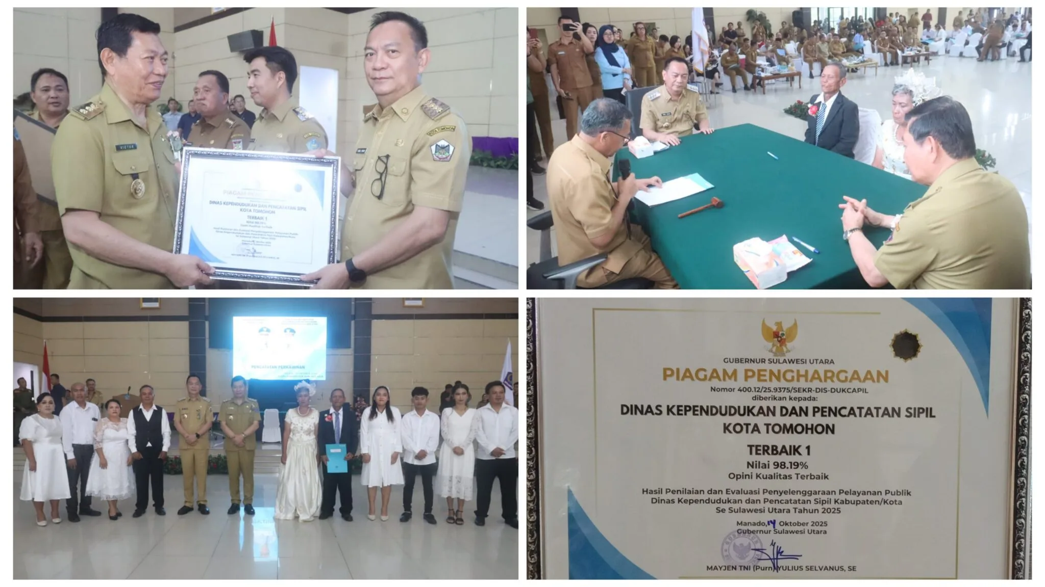 Dalam kegiatan yang sama, Pemerintah Kota Tomohon menerima Piagam Penghargaan sebagai Kota Terbaik I dengan nilai 98,19% (Opini Kualitas Terbaik) dalam Penilaian dan Evaluasi Penyelenggaraan Pelayanan Publik Dinas Kependudukan dan Pencatatan Sipil Kabupaten/Kota se-Sulawesi Utara Tahun 2025.