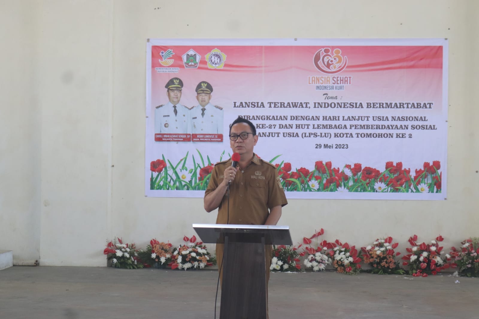 NusantaraInfo.net|| Wali Kota Tomohon menghadiri kegiatan Lansia Terawat Indonesia Bermartabat yang dirangkaikan dengan Hari Lanjut Usia Nasional (HLUN) ke-27 dan Hut Lembaga Pemberdayaan Sosial Lanjut Usia (LPS-LU) Kota Tomohon ke 2, di Gedung Gor Babe Palar Walian. Senin, (29/05/2023). Khadim dalam ibadah ini : Pdt Senduk G.A Roeroe, M.Th selaku Ketua FKUB Kota Tomohon.